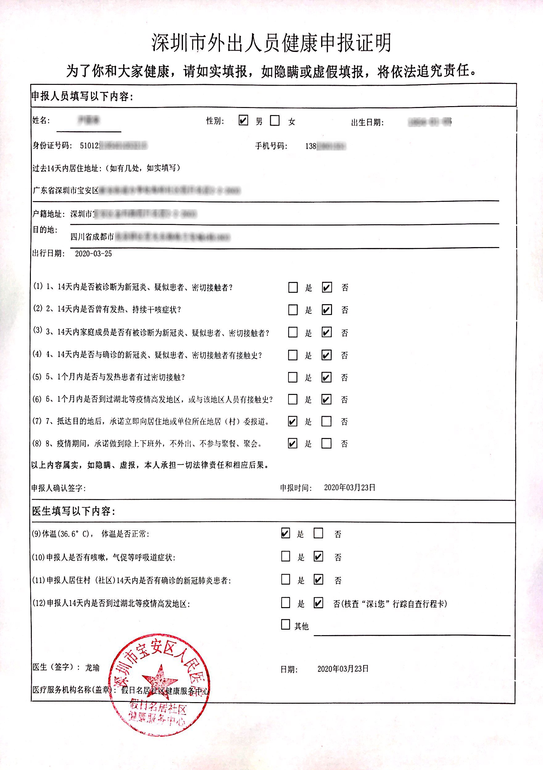 為了保障疫情期間深圳市外出人員的有序正常出行,根據(jù)廣東省要求,疫情期間因出差、經(jīng)商、務(wù)工等原因需到外省(市、區(qū) )的居民,如果出行目的地要求提供健康證明,可免費申請辦理《深圳市外出人員健康申報證明》。