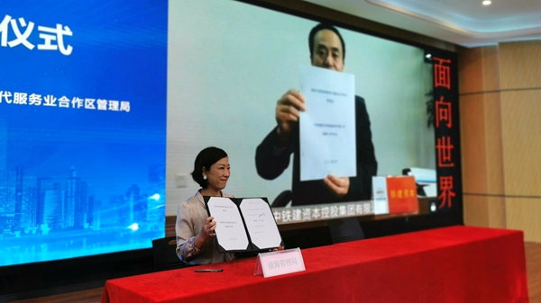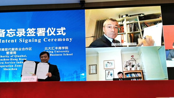 與以往不同,本次簽約儀式采用了現(xiàn)場簽約與視頻連線“云簽約”結合的特殊方式。前海管理局與中鐵建資本控股集團有限公司,與國研科工、彩虹魚,與北京大學匯豐商學院、劍橋大學嘉治商學院的合作采用了“云簽約”。