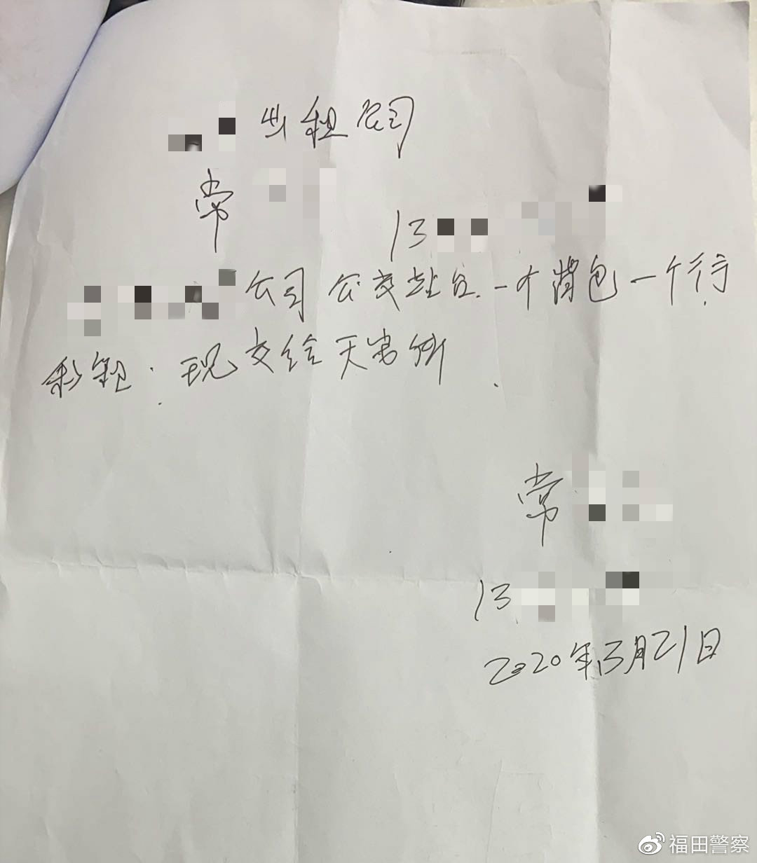 3月21日晚,一輛的士開到深圳市公安局福田分局天安派出所門口,的士司機從車上拿下來一個黑色的背包和銀色的行李箱到前臺。