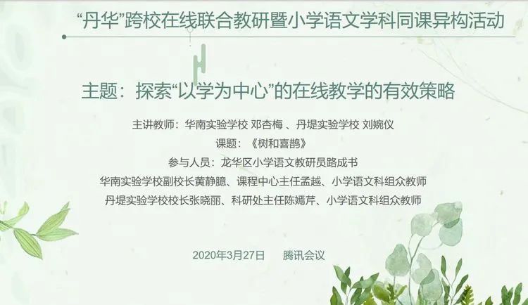 見圳客戶端、深圳新聞網(wǎng)2020年3月31日訊 (記者 潘寶儀)丹堤實(shí)驗(yàn)學(xué)校與華南實(shí)驗(yàn)學(xué)校異苔同岑,相聚“丹華”,以鄧杏梅老師與劉婉儀老師關(guān)于《樹和喜鵲》的同課異構(gòu)為課例,開展了丹華跨校“以學(xué)為中心”的小學(xué)語文在線教學(xué)策略研討會。