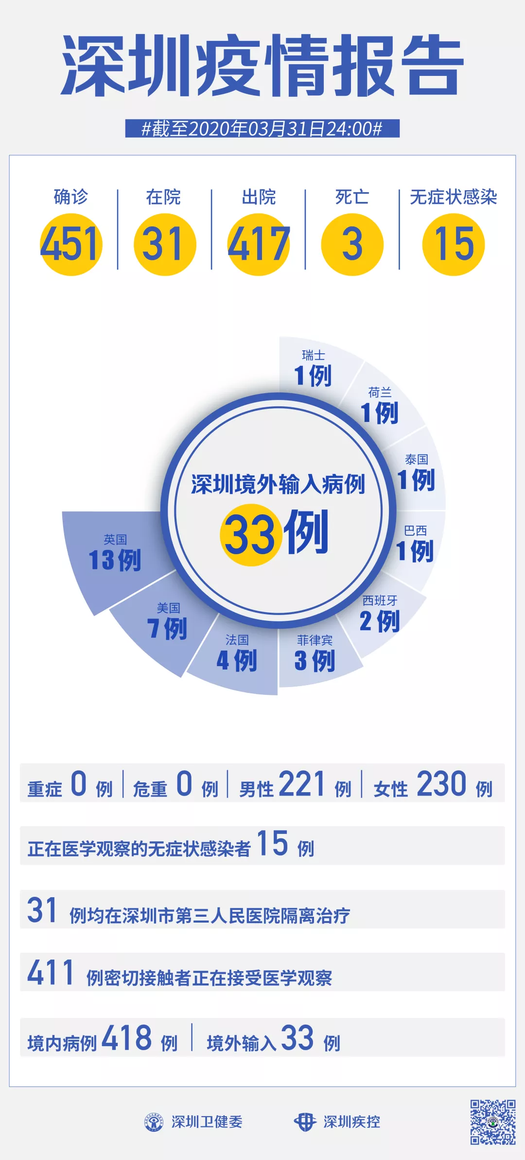 截至3月31日24時,深圳累計報告新冠肺炎病例451例。3月31日當天新增境內(nèi)病例1例、無癥狀感染者1例。 【境內(nèi)病例】:新增1例湖北返深確診病例,出院1例,累計報告境內(nèi)病例418例。 【境外輸入】:當日無新增病例,累計報告境外輸入病例33例。 【無癥狀感染者】:新增1例湖北返深無癥狀感染者。全市尚在醫(yī)學觀察的無癥狀感染者15例,其中境外輸入9例。 累計報告確診病例中,男性221例、女性230例。 目前,死亡3例,累計出院417例。31例確診病例均在深圳市第三人民醫(yī)院隔離治療。 411名密切接觸者正在接受醫(yī)學觀察。 無癥狀感染者7問7答 01.什么是新型冠狀病毒無癥狀感染者? 新冠病毒無癥狀感染者(以下簡稱無癥狀感染者)是指無相關臨床癥狀,如發(fā)熱、咳嗽、咽痛等可自我感知或可臨床識別的癥狀與體征,但呼吸道等標本新冠病毒病原學檢測陽性者。無癥狀感染者可分為兩種情形: 一是感染者核酸檢測陽性,經(jīng)過14天潛伏期的觀察,均無任何可自我感知或可臨床識別的癥狀與體征,始終為無癥狀感染狀態(tài); 二是感染者核酸檢測陽性,采樣時無任何可自我感知或可臨床識別的癥狀與體征,但隨后出現(xiàn)某種臨床表現(xiàn),即處于潛伏期的“無癥狀感染”狀態(tài)。 02.無癥狀感染者有無傳染性? 根據(jù)國家和部分省份開展的密切接觸者監(jiān)測數(shù)據(jù),無癥狀感染者的密切接觸者存在二代病例續(xù)發(fā),流行病學調(diào)查中發(fā)現(xiàn)個別由無癥狀感染者導致的聚集性疫情,有小樣本量的研究顯示無癥狀感染者呼吸道樣本中的病毒載量與確診病例沒有太大差異。 綜合目前的監(jiān)測和研究,無癥狀感染者存在傳染性,但其傳染期長短、傳染性強弱、傳播方式等尚需開展進一步科學研究。 部分專家認為鑒于無癥狀感染者的呼吸道標本能檢出病原核酸,但由于無咳嗽、打噴嚏等臨床癥狀,病原排出體外引起傳播的機會較確診病例相對少一些。 03.我國關于新型冠狀病毒無癥狀感染者的防控要求是什么? 國家衛(wèi)生健康委在1月28日發(fā)布《新冠病毒感染的肺炎防控方案》(第三版)中就將新型冠狀病毒無癥狀感染者納入防控管理,在其后的修訂過程中均對無癥狀感染者的報告、管理等提出了明確具體的要求。各級各類醫(yī)療衛(wèi)生機構(gòu)發(fā)現(xiàn)無癥狀感染者,應于2小時內(nèi)進行網(wǎng)絡直報。 縣(區(qū))級疾控機構(gòu)接到無癥狀感染者報告后,24小時內(nèi)完成個案調(diào)查,并及時進行密切接觸者登記,將個案調(diào)查表或調(diào)查報告及時通過傳染病報告管理信息系統(tǒng)進行上報。 無癥狀感染者應集中隔離14天,原則上集中隔離滿14天且兩次連續(xù)標本核酸檢測陰性者(采樣時間至少間隔24小時)可解除隔離; 如果核酸檢測仍為陽性者,則繼續(xù)隔離醫(yī)學觀察。 隔離醫(yī)學觀察期間如出現(xiàn)臨床表現(xiàn),應及時轉(zhuǎn)歸為確診病例,進行規(guī)范治療。 無癥狀感染者密切接觸者也要進行14天的集中隔離醫(yī)學觀察。 04.無癥狀感染者通過什么途徑發(fā)現(xiàn)?截至目前我國發(fā)現(xiàn)了多少例無癥狀感染者? 目前我們主要通過以下途徑主動發(fā)現(xiàn)無癥狀感染者: 一是對新型冠狀病毒肺炎病例的密切接觸者開展醫(yī)學觀察期間的主動檢測; 二是在聚集性疫情調(diào)查中開展的主動檢測; 三是在新型冠狀病毒肺炎病例的傳染源追蹤過程中對暴露人群主動檢測; 四是對部分有境內(nèi)外新型冠狀病毒肺炎病例持續(xù)傳播地區(qū)的旅行史和居住史人員開展主動檢測。 05.如何做好無癥狀感染者的風險評估及其防控? 無癥狀感染者存在著傳播風險。 一是傳播的隱匿性。由于無癥狀感染者無任何明顯的癥狀與體征,其在人群中難以被發(fā)現(xiàn),其導致的傳播也難以預防。 二是癥狀的主觀性。癥狀輕微或不典型者可能認為自己沒有感染新冠病毒,不主動去醫(yī)療機構(gòu)就診,在日常的診療工作中難以被發(fā)現(xiàn)。 三是發(fā)現(xiàn)的局限性。由于存在檢測窗口期,采用核酸檢測和血清學檢測方法難以發(fā)現(xiàn)全部無癥狀感染者,現(xiàn)有的無癥狀感染者主要是通過病例的密切接觸者主動篩查、感染來源調(diào)查、聚集性疫情調(diào)查和對高風險地區(qū)人員的主動檢測發(fā)現(xiàn)的,尚有部分無癥狀感染者難以被發(fā)現(xiàn)。 為此,要突出做好無癥狀感染者監(jiān)測,有針對性加大篩查力度,將檢測范圍擴大至已發(fā)現(xiàn)病例和無癥狀感染者的密切接觸者、重點地區(qū)和重點人群等。一旦發(fā)現(xiàn)無癥狀感染者,要立即按“四早”要求,嚴格集中隔離和醫(yī)學觀察,對密切接觸者也要實施隔離醫(yī)學觀察。 由于部分無癥狀感染者始終無癥狀,實際防控工作中無法將發(fā)現(xiàn)和隔離無癥狀感染者作為主導措施。因此我們?nèi)詫⒗^續(xù)著重于及時發(fā)現(xiàn)隔離確診患者,并做好密切接觸者管理。 我國經(jīng)驗表明,做好確診病例的及時發(fā)現(xiàn)和隔離,并適度采取減少人際接觸等措施,可以基本阻斷疫情傳播。 06.下一步如何做好無癥狀感染者防控管理? 一是完善防治方案。 抓緊在疫情重點地區(qū)抽取一定比例樣本,開展無癥狀感染者調(diào)查和流行病學分析研究,完善防控措施,修訂完善防控方案和診療