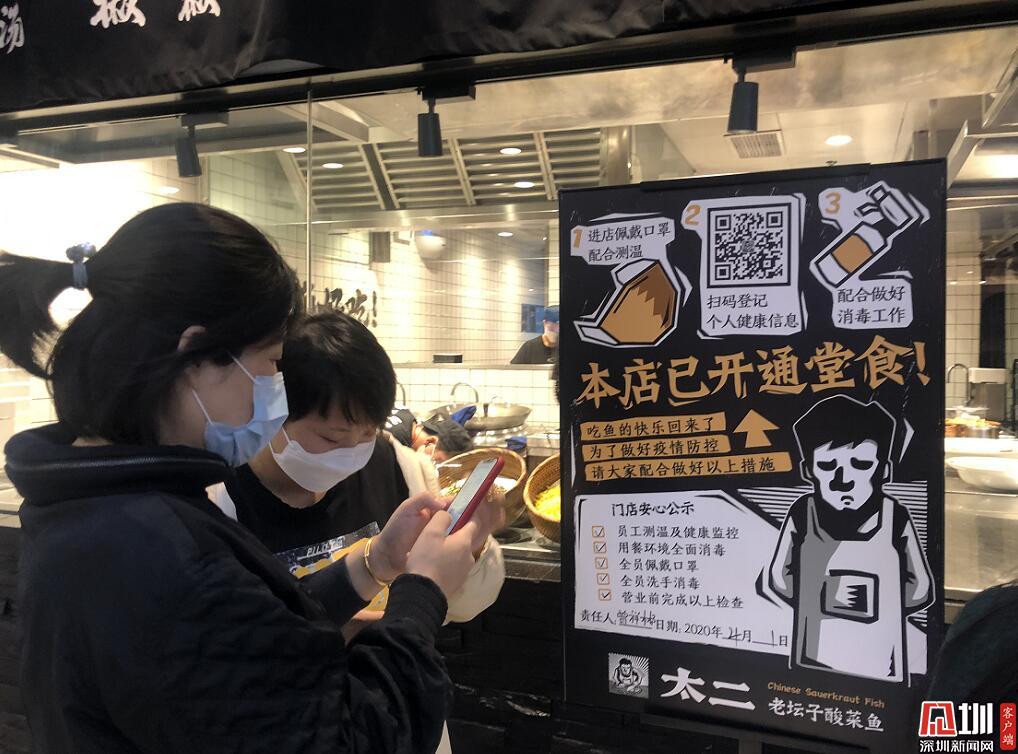 在太二酸菜魚門口,多位市民正按照員工要求,排隊(duì)掃碼登記個(gè)人健康信息。太二酸菜魚工作人員表示,門店嚴(yán)格按照要求,做好員工和消費(fèi)者體溫檢測、健康監(jiān)控和佩戴口罩洗手消毒等防疫防控工作。