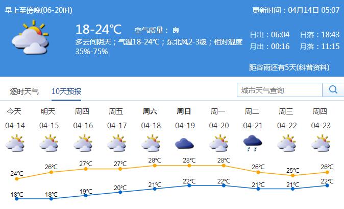見圳客戶端·深圳新聞網2020年4月14日訊 據(jù)深圳市氣象臺預測,14日我市多云間陰天;氣溫18-24℃;東北風2-3級;相對濕度35%-75%,全市森林火險黃色預警信號生效中。今天比較適合早晚清涼中午稍熱的夾心搭配,出門須做好防曬。