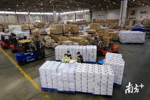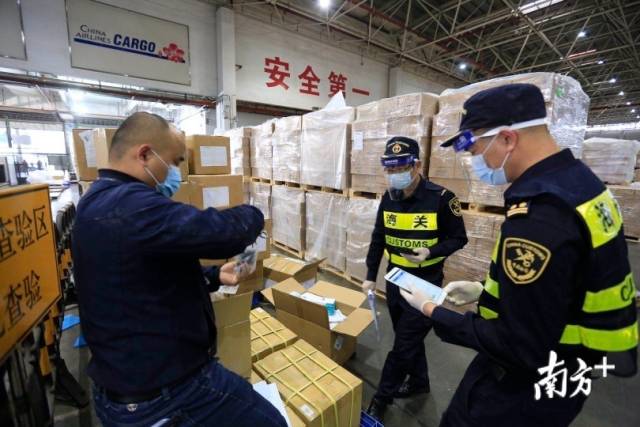 深圳海關(guān)保障深圳向國際友好城市捐贈(zèng)的抗擊疫情物資順暢通關(guān)。圖為海關(guān)人員正在檢查貨場防疫物資。南方日?qǐng)?bào)記者朱洪波攝