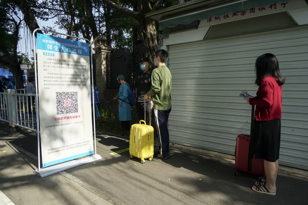 帶行李箱的學(xué)生走專用通道,依次完成掃碼核驗(yàn)、測量體溫等流程后進(jìn)入校園。