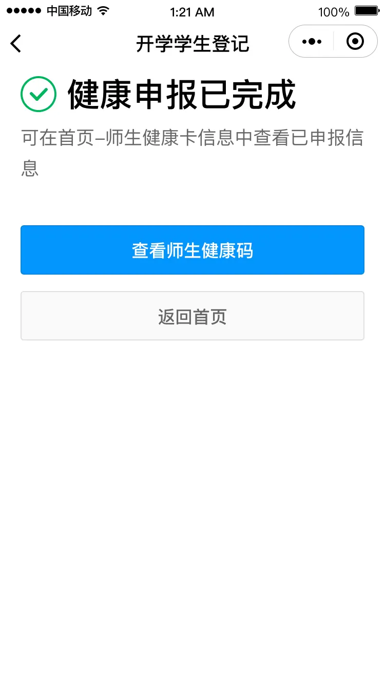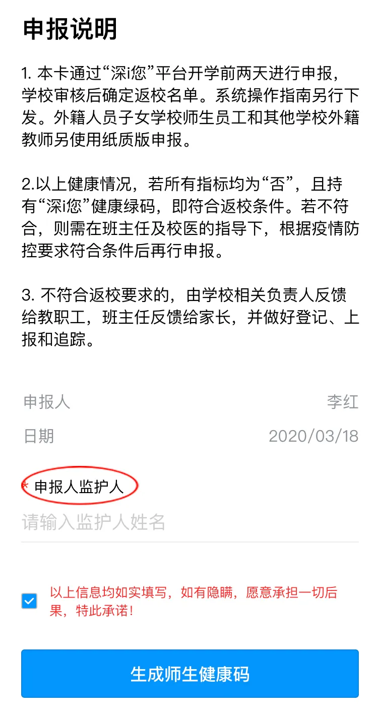 健康信息申報后,請勾選申報承諾,點擊“生成師生健康碼”即可完成健康申報。