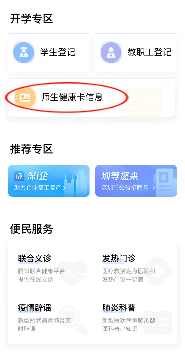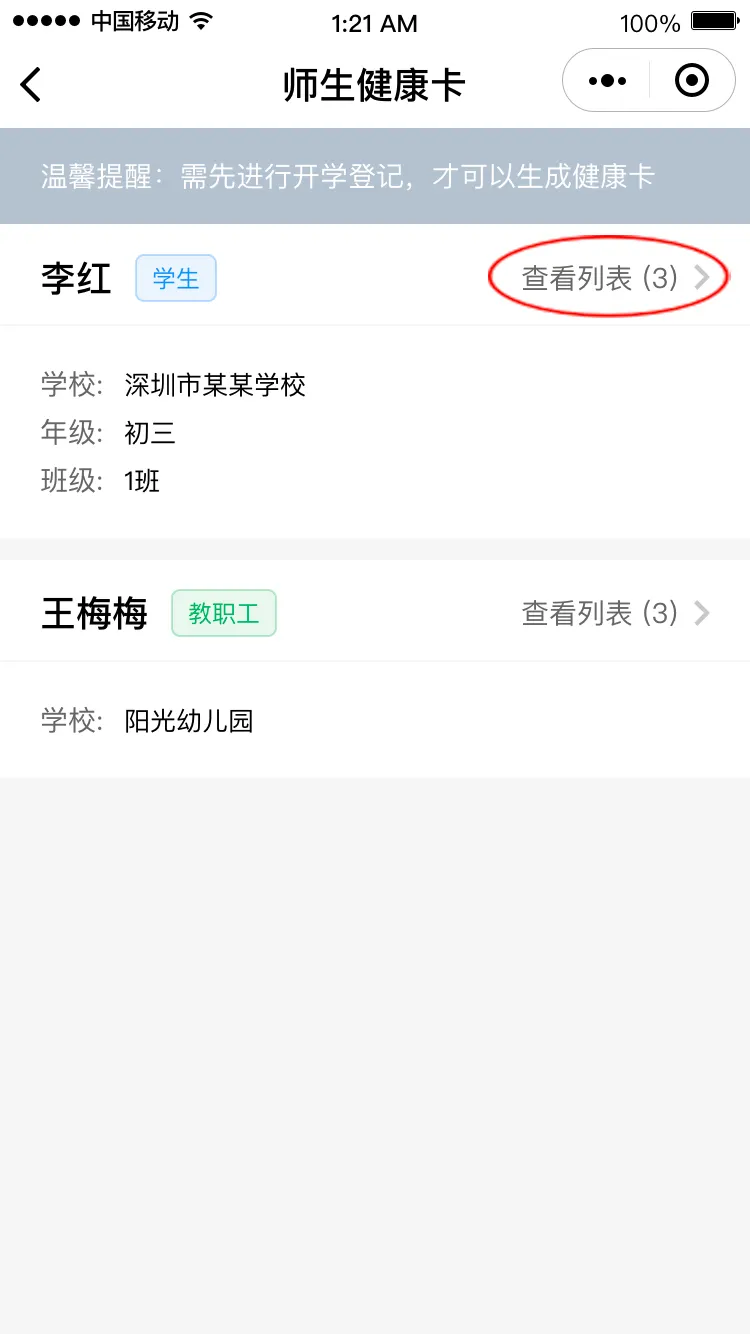 在開學專區(qū),點擊“師生健康卡信息”,進入師生健康卡人員列表。