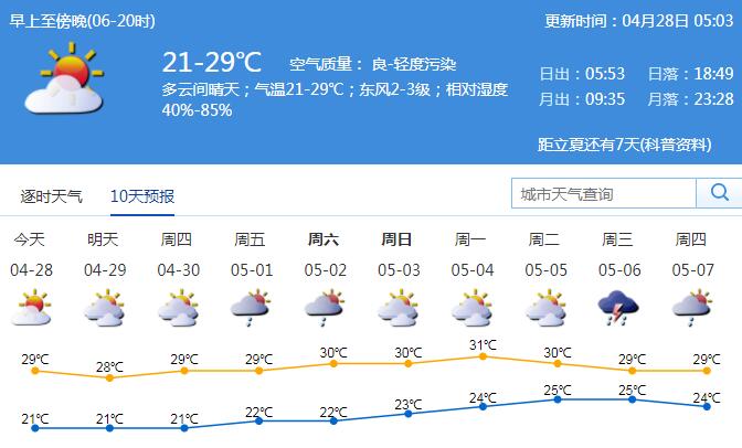 見圳客戶端·深圳新聞網(wǎng)2020年4月28日訊 28日多云間晴天,氣溫21-29℃,東風(fēng)2-3級,相對濕度40%-85%;29-30日多云為主,空氣較干燥;5月1-5日轉(zhuǎn)偏南暖濕氣流影響,多云,部分時(shí)間有分散陣雨,早晚有輕霧。