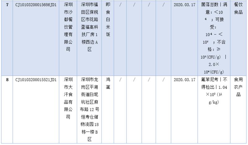 見圳客戶端·深圳新聞網(wǎng)2020年5月1日訊(深圳特區(qū)報記者 楊德琦)4月30日,深圳市市場監(jiān)督管理局發(fā)布第十四期食品安全抽樣檢驗情況通報,3月共抽檢餐飲環(huán)節(jié)食品1009批次,涉及餐飲環(huán)節(jié)經(jīng)營主體919家次,共檢測食品指標6347項次。其中不合格樣品8批次,涉及不合格食品類別有食用農(nóng)產(chǎn)品6批次,黃豆芽、蘿卜、雞蛋、油麥菜、牛蛙等在列;餐飲食品1批次,為即食白米飯;食用油、油脂及其制品1批次,為煎炸用油。涉及不合格項目類別為獸藥殘留、農(nóng)藥殘留、非食用物質(zhì)、微生物污染、品質(zhì)指標。