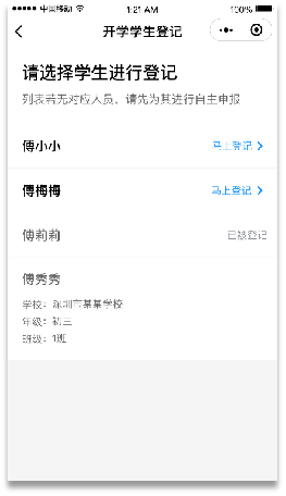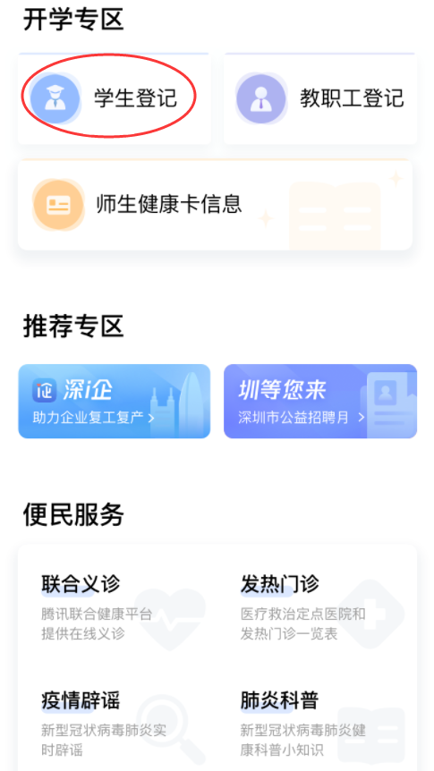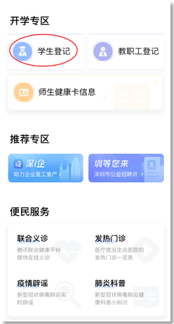 ①在首頁開學(xué)專區(qū),點擊“學(xué)生登記”進入申報人員列表,進行自主申報和實名認(rèn)證,再進行開學(xué)登記。