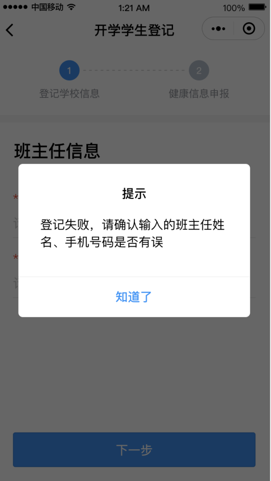 ②進入“學(xué)生登記”頁面,點擊“馬上登記”按鈕,填寫班主任姓名和手機號碼后點擊“下一步”,然后選擇對應(yīng)的班級,進入健康申報卡界面。