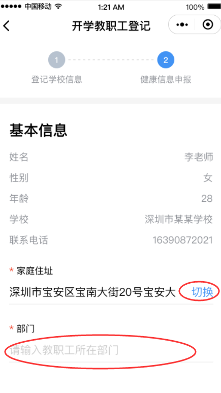 ③完成健康信息申報,包括選擇家庭住址、填寫所在部門、申報健康情況等,請勾選申報承諾,點擊“生成師生健康碼”即可完成健康申報。