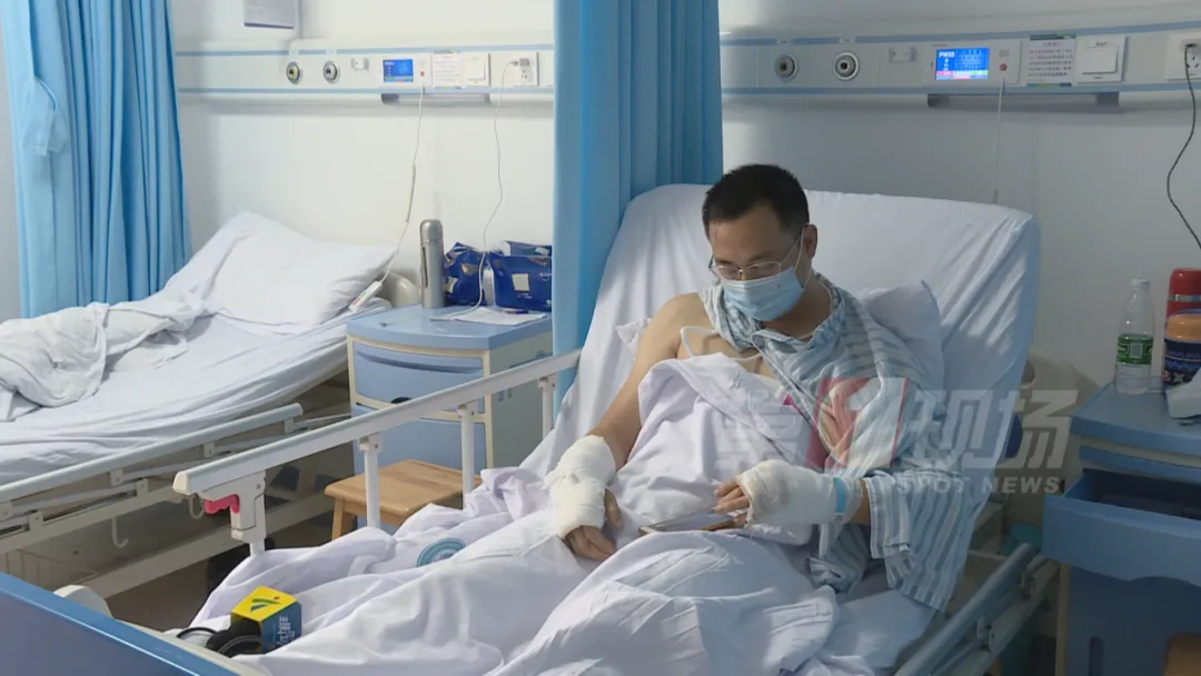 記者在病房見到了救人受傷的黃師傅。他說當(dāng)時(shí)一心只想著救人,忽略了做好安全措施。