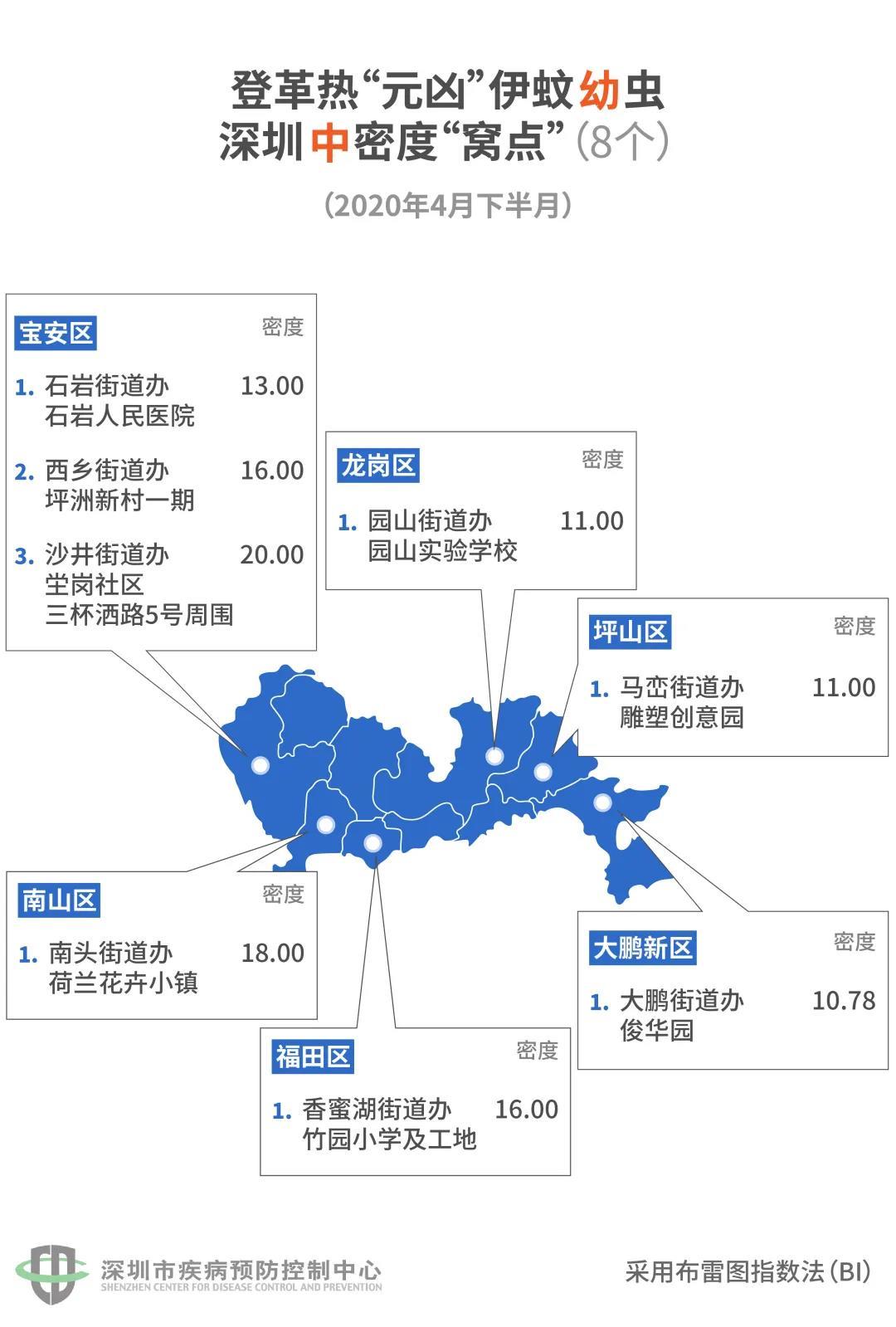 據(jù)悉,在全市設置的423個監(jiān)測點中,不合格的有104個,占24.59%。其中低密度有79個,中密度有20個,高密度有5個。5個“蚊子窩”全在寶安!