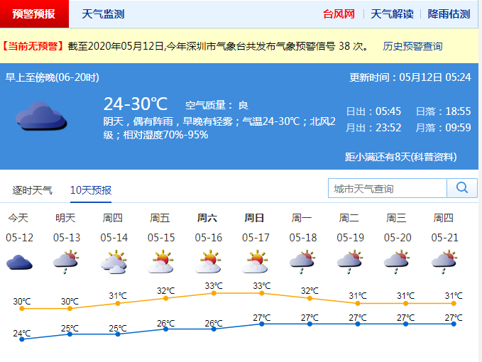 見圳客戶端·深圳新聞網(wǎng)2020年5月12日訊 深圳昨夜雷電+大風(fēng)黃色+暴雨黃色預(yù)警齊生效,市氣象臺于2020年05月11日23時30分在全市取消暴雨黃色、大風(fēng)黃色預(yù)警。預(yù)計12日白天多云間陰天,有陣雨。13日陣雨轉(zhuǎn)多云,天況逐漸轉(zhuǎn)好,14-17日多云為主,陽光充足,天氣再趨炎熱。