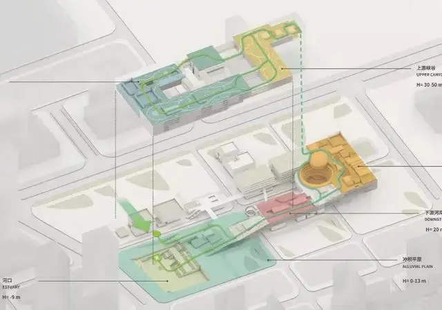產(chǎn)業(yè)生態(tài)雨林的三個(gè)層級(jí)都可經(jīng)由一個(gè)城市公園的多層級(jí)通道系統(tǒng)抵達(dá),仿佛曲折蜿蜒的河水流過(guò)緩坡。