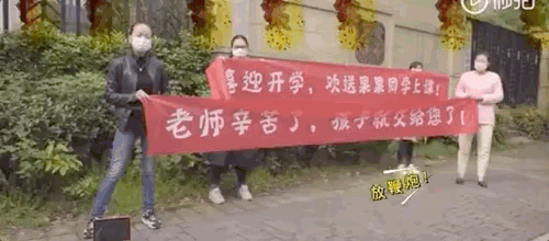 喜上眉梢的家長(zhǎng)們甚至站在校門口拉起橫幅:喜迎開學(xué),歡送上課!