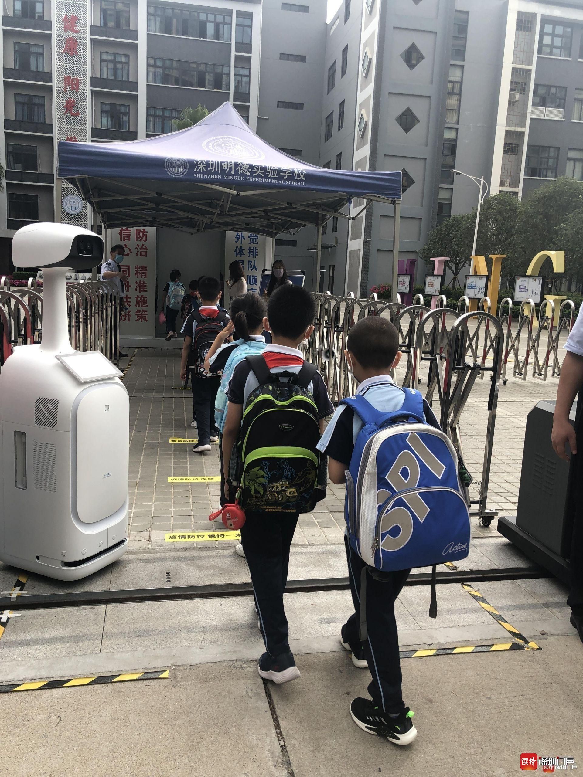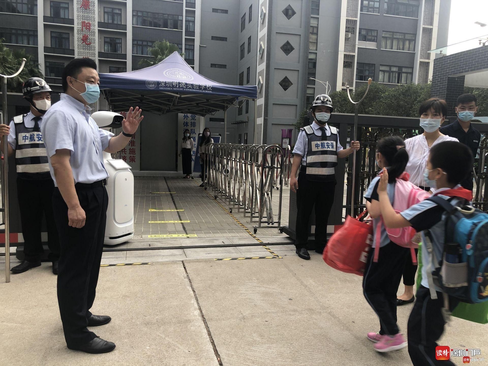 “同學(xué)們好!”“歡迎回來!”從7點(diǎn)起,明德實(shí)驗(yàn)學(xué)校校長(zhǎng)魯江與工作人員就在香蜜校區(qū)校門口迎候?qū)W生們,提醒孩子們戴好口罩,也與家長(zhǎng)們交流返校事宜。校門口的一臺(tái)超氧水消殺機(jī)器人也在積極投入工作,工作人員在后臺(tái)控制面板可以監(jiān)測(cè)到入校人員的體溫情況。