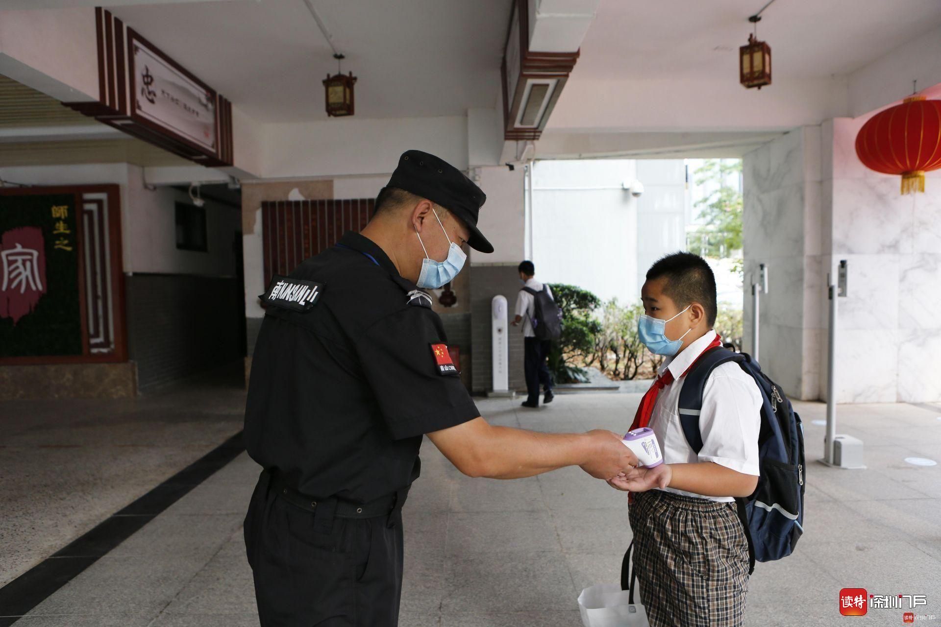 南山區(qū)科創(chuàng)學(xué)校,安保人員正在為返校的學(xué)生測(cè)量體溫。