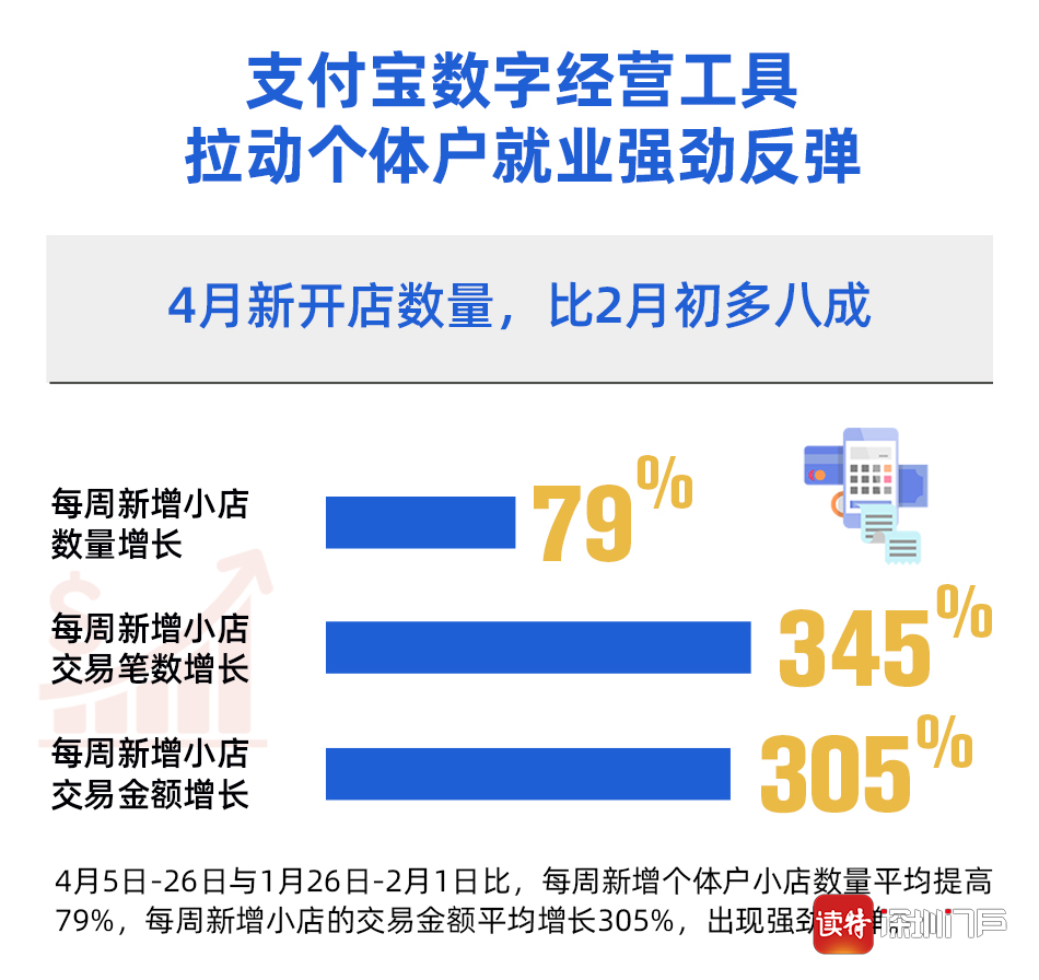 北京大學(xué)數(shù)字金融研究中心通過分析支付寶最新數(shù)據(jù)發(fā)現(xiàn),與疫情中最低點相比,全國個體戶就業(yè)形勢已出現(xiàn)強勁反彈:隨著復(fù)工復(fù)產(chǎn)的全面推進(jìn)和消費券的發(fā)放,4月以來與疫情最低點2月1日當(dāng)周相比,每周新增個體戶小店數(shù)量平均提高79%,每周新增小店的交易金額平均增長305%。