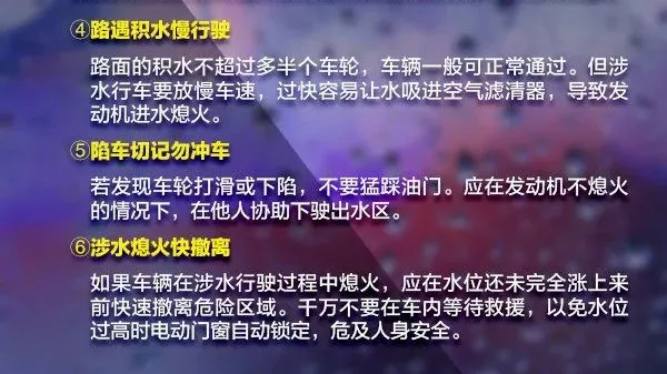 √雨天路滑,注意車輛行駛安全,控制車速防止追尾等事故的發(fā)生,繞開積水隧道涵洞和城市低洼區(qū)域,防止跌入窨井、地坑,不要在深水區(qū)逗留。