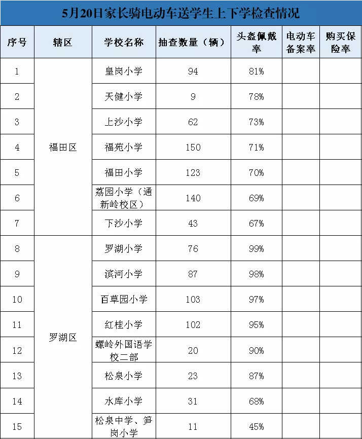5月20日,深圳交警在全市范圍內(nèi)選取了70所學(xué)校進(jìn)行抽查,共5037輛電動(dòng)車被查,頭盔佩戴率達(dá)89%。其中松泉中學(xué)、筍崗小學(xué)、西麗學(xué)校、福華學(xué)校頭盔佩戴率不足一半。