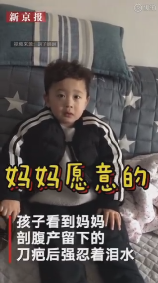 視頻中,孩子無意中看到媽媽剖腹產(chǎn)生他時留下的刀疤