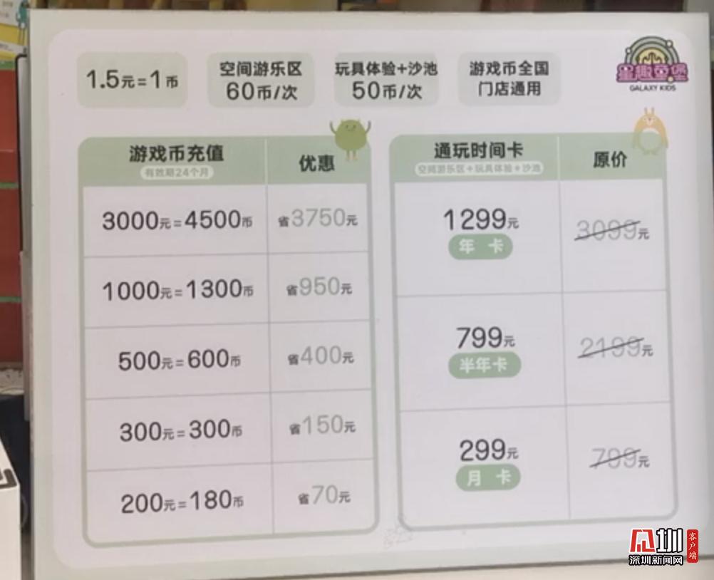 星際傳奇采用多場所差異化的收費(fèi)制度,每個(gè)項(xiàng)目價(jià)格均有不同,深圳新聞網(wǎng)記者從工作人員處了解到每位兒童的單次消費(fèi)均價(jià)在150元左右,陪同的大人免費(fèi)。有需要的市民也可以選擇辦理月卡或者是年卡,享受更大力度的折扣。游樂場內(nèi)部地面干凈整潔,有家長休息區(qū),在前臺(tái)有充電寶租借。