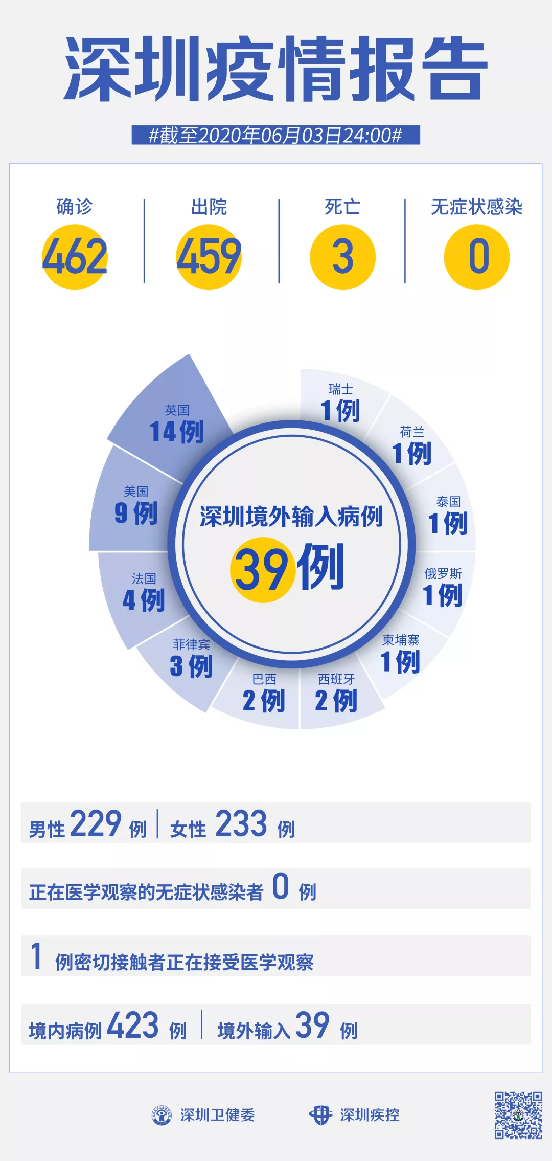 截至6月3日24時(shí),深圳累計(jì)報(bào)告新冠肺炎病例462例。