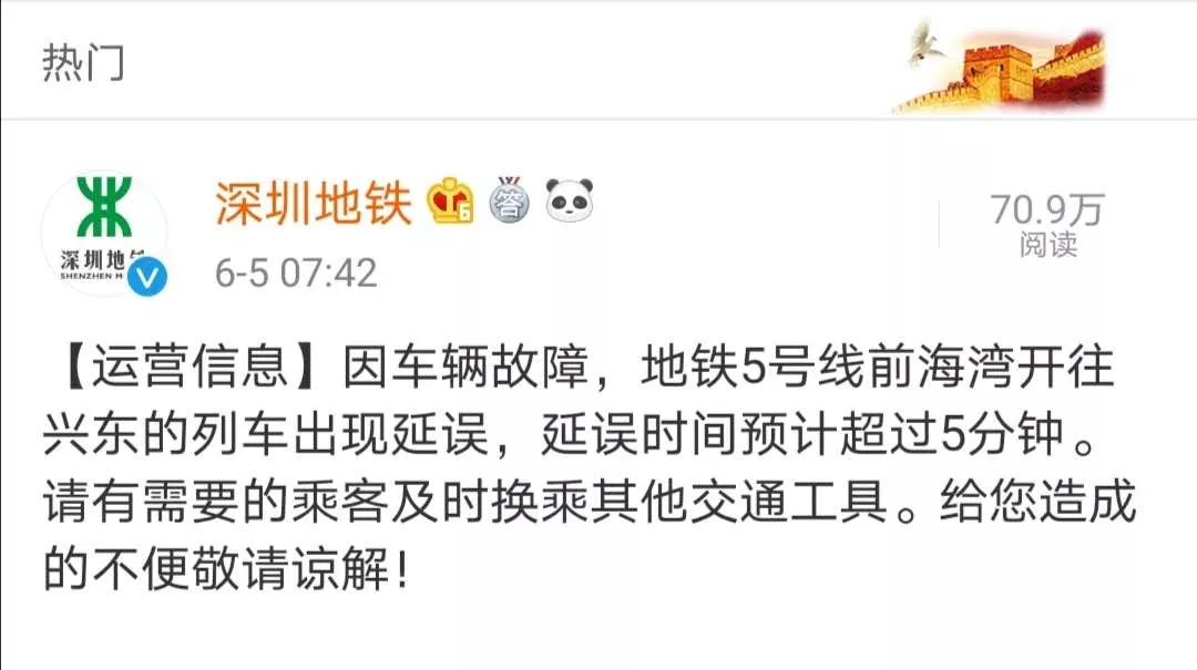 見圳客戶端·深圳新聞網(wǎng)2020年6月5日訊 今早7點(diǎn)42分深圳地鐵官方微博發(fā)布公告:因車輛故障,地鐵5號線前海灣開往興東的列車出現(xiàn)延誤,延誤時(shí)間預(yù)計(jì)超過5分鐘。