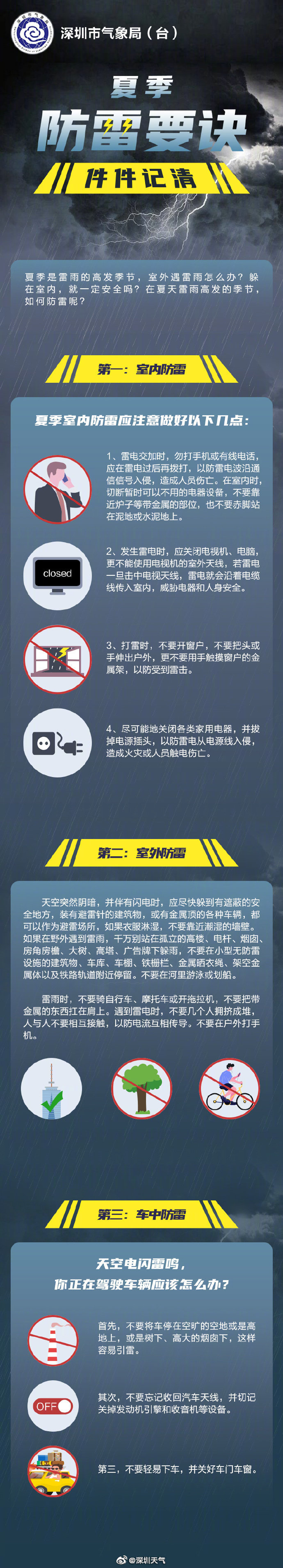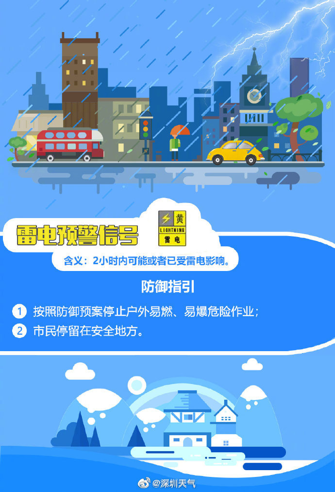 深圳市氣象臺(tái)于2020年06月05日11時(shí)15分在全市發(fā)布雷電預(yù)警,預(yù)計(jì)2小時(shí)內(nèi)全市將受雷電影響,市民停留在安全地方;按照防御預(yù)案停止戶外易燃易爆危險(xiǎn)作業(yè),并加強(qiáng)?;瘓?chǎng)所安全管理。