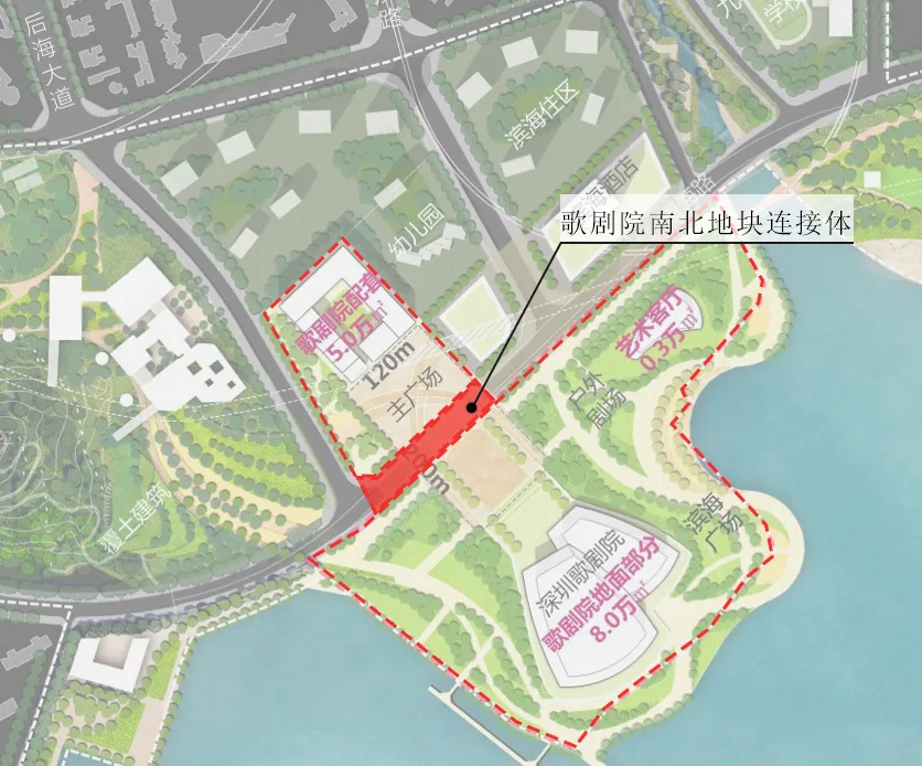 歌劇院分為南北區(qū)兩個地塊,南區(qū)為歌劇院主體功能地塊,北區(qū)為歌劇院配套功能地塊,南北區(qū)在地面被現(xiàn)狀望海路分割,在地下被擬建的望海路地下快速路分割,南北區(qū)被分割成獨立的兩個區(qū)域。