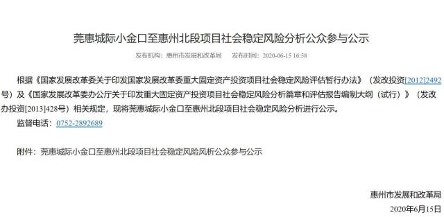 6月15日下午,惠州市發(fā)改局發(fā)布《莞惠城際小金口至惠州北段項目社會穩(wěn)定風險分析公眾參與公示》,征求公眾對項目建設(shè)的意見和建議。