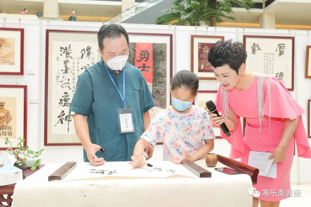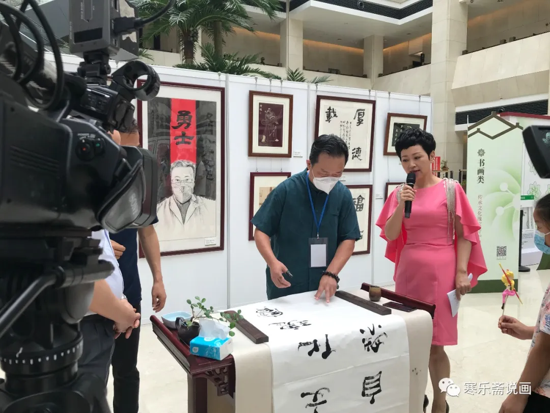 王和平在活動(dòng)現(xiàn)場(chǎng)揮指書(shū)寫(xiě)“傳承文化瑰寶,守護(hù)自然之家”并接受主持人采訪。