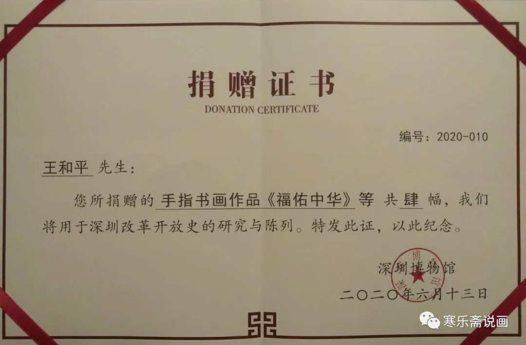 王和平手指書(shū)畫(huà)作品《福佑中華》等四幅獲得博物館收藏證書(shū)。