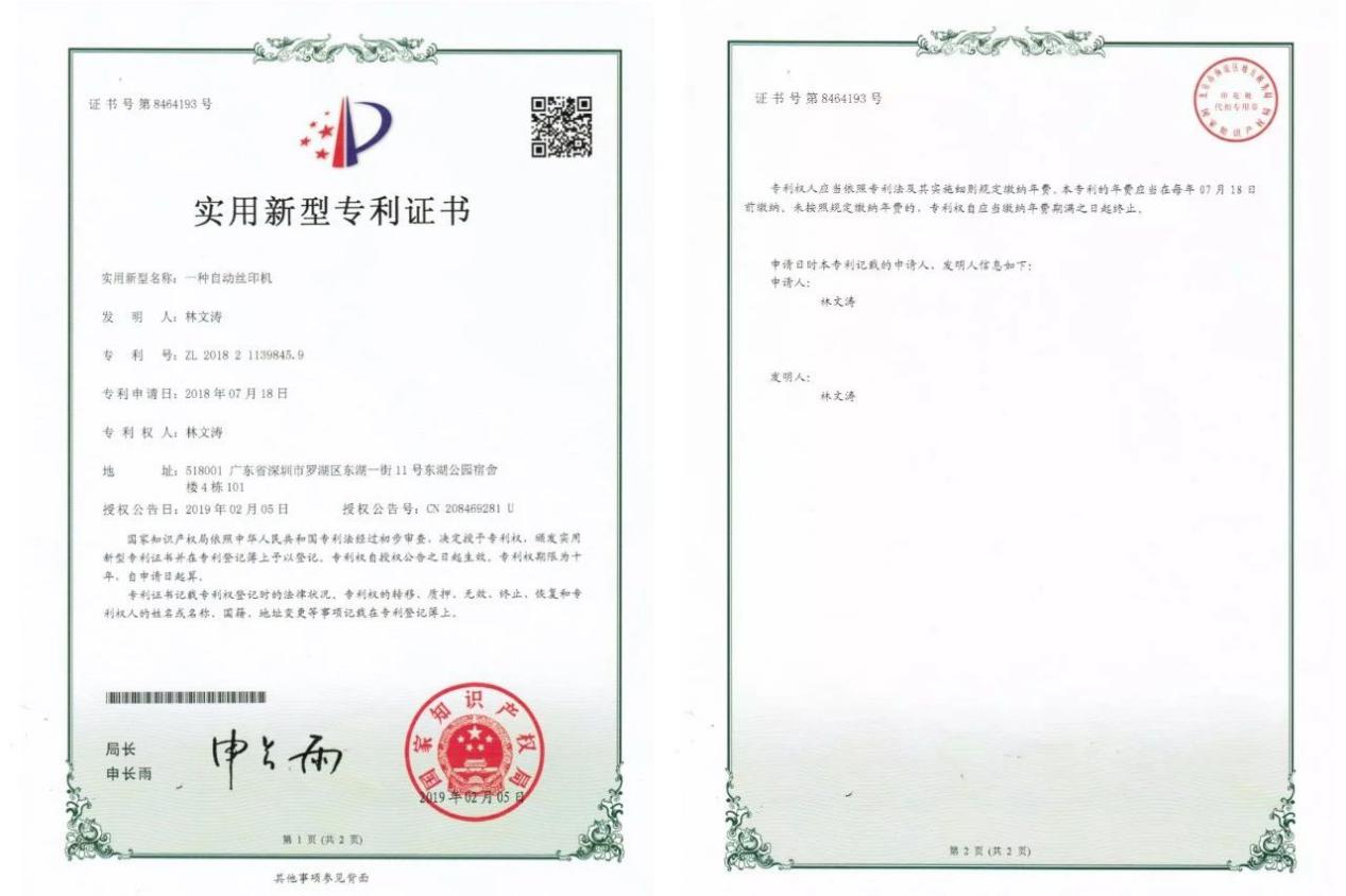 2019年12月,林文濤參加中國(guó)科協(xié)舉行的“全國(guó)青少年科技創(chuàng)新大賽”,獲得深圳市二等獎(jiǎng)。他發(fā)明的成品雨傘自動(dòng)絲印機(jī),榮獲實(shí)用新型專利證書。這種自動(dòng)絲印機(jī),極大地提高了工作效率,在一把雨傘上印刷一個(gè)logo僅僅需要單人5秒的時(shí)間。