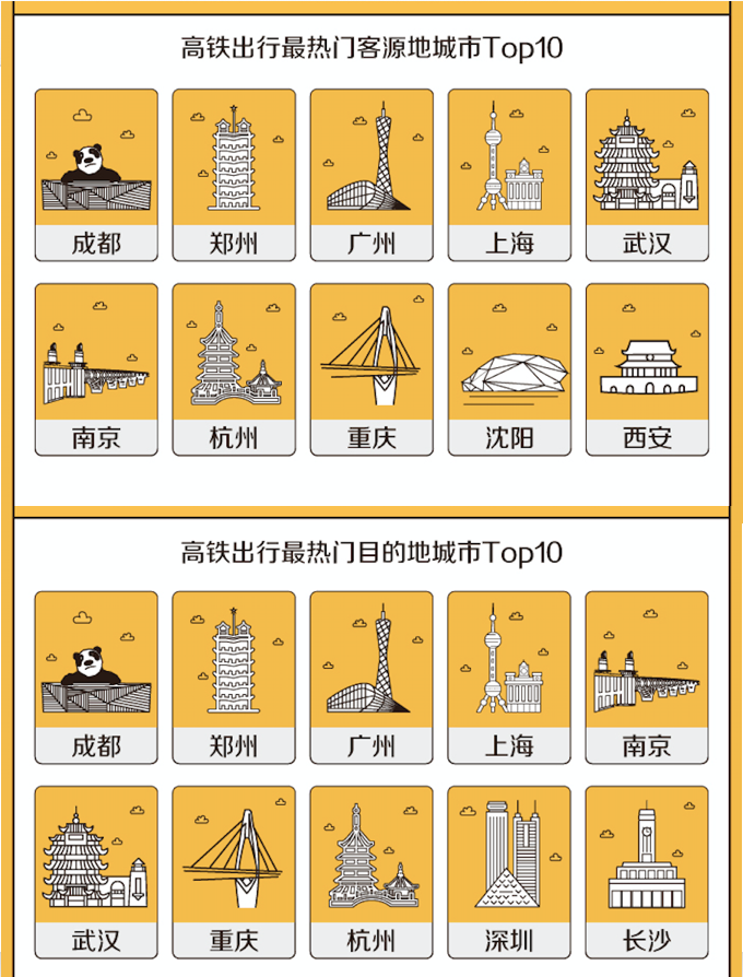 除此之外,城市周邊高鐵短途游受歡迎,特別是2小時內(nèi)的高鐵行程受到家庭出游的青睞。比如,上海開往杭州、蘇州、南京;廣州開往深圳、東莞、珠海;成都開往重慶、綿陽、眉山;武漢開往孝感、襄陽、黃石等城市短途高鐵線路預定量排名靠前。