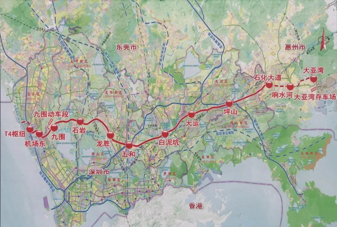 深大城際:起自深圳寶安國際機場T4樞紐,經(jīng)寶安、龍華、龍崗、坪山至惠州大亞灣,全長86公里,計劃總投資438.8億元。