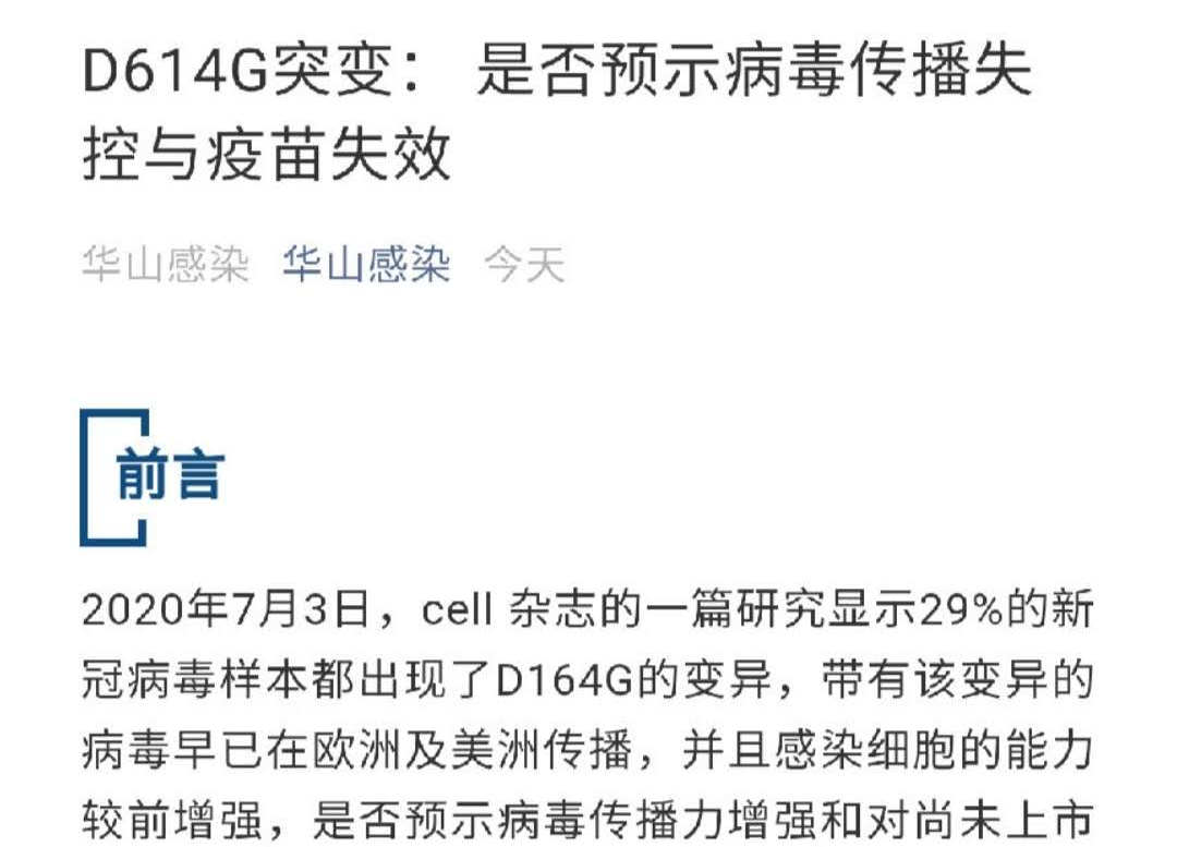 張文宏稱,特別是在7月3日,國際著名雜志《細(xì)胞》發(fā)表文章顯示,29%的新冠病毒樣本出現(xiàn)了D164G的變異,此次北京疫情反彈中發(fā)現(xiàn)的病毒株也有這個突變。