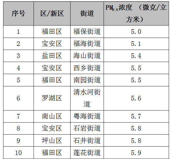 今年6月,全市74個(gè)街道PM2.5濃度在5.0-10.2微克/立方米之間,均值為7.0微克/立方米。排名前十的是:福保、福海、海山、西鄉(xiāng)、南園、清水河、粵海、石巖、石井和蓮花等街道,排名倒數(shù)前十的是:觀瀾、坪地、龍?zhí)?、大浪、馬田、公明、龍崗、龍華、沙井和鳳凰等街道。
