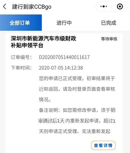 客戶完成補貼申請?zhí)峤缓?,平臺將進行首次初審,初審結(jié)果將于近期返回并通過短信方式告知客戶。屆時,客戶可通過登錄“建行到家CCBgo-我的-我的申請”查看審核進展。