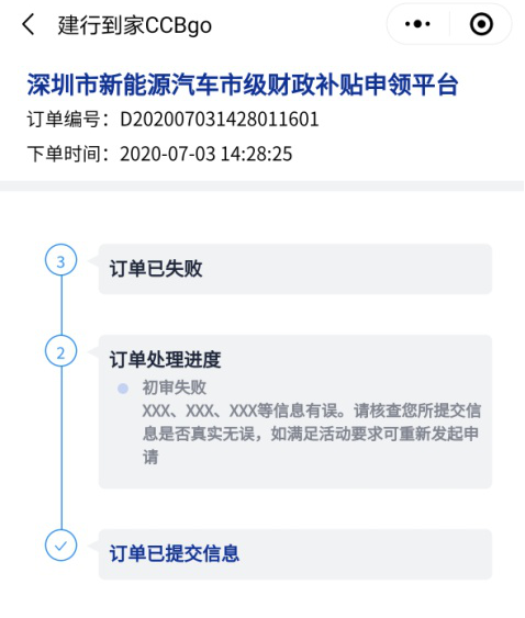 如客戶初審、終審失敗,重新進入“深圳市新能源汽車市級財政補貼申領(lǐng)平臺”發(fā)起申請即可。