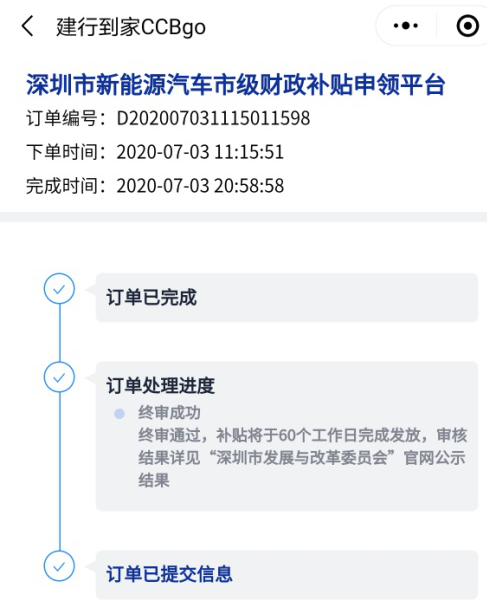 個人消費者通過“深圳市新能源汽車市級財政補貼申領(lǐng)平臺”填報補貼申請資料且通過初驗后,可在60個工作日后獲得市級新能源小汽車財政補貼。申請人應(yīng)為車輛所有人本人,與提供有效材料須屬同一人,不可代辦。