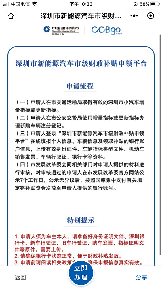 客戶可通過i深圳微信公眾號、深圳市發(fā)展和改革委員會官方網(wǎng)站或微信公眾號、深圳交警微信公眾號或建行到家CCBgo小程序登錄“深圳市新能源汽車市級財政補貼申領(lǐng)”平臺。