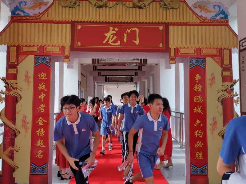 龍崗六約學(xué)校全體行政人員與九年級(jí)老師,穿著紅色送考服送考,寓意“鴻運(yùn)當(dāng)頭”。九年級(jí)學(xué)生走過龍門,踏上紅地毯,自帶炫酷出場(chǎng)bgm。(記者李麗、周紅聲)