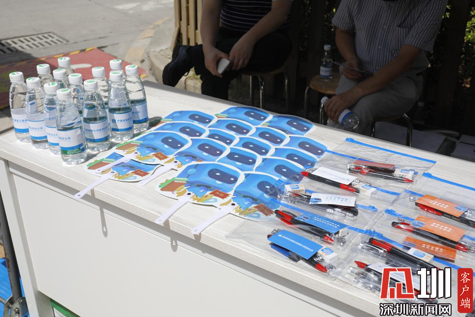 為考生和門口等待的家長準備的文具包、風扇和水。