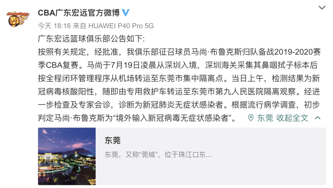 7月19日,廣東新增境外輸入無(wú)癥狀感染者1例,為東莞報(bào)告,來(lái)自美國(guó),在入境口岸發(fā)現(xiàn)。經(jīng)確認(rèn),此人是CBA廣東宏遠(yuǎn)男籃外援馬尚·布魯克斯。