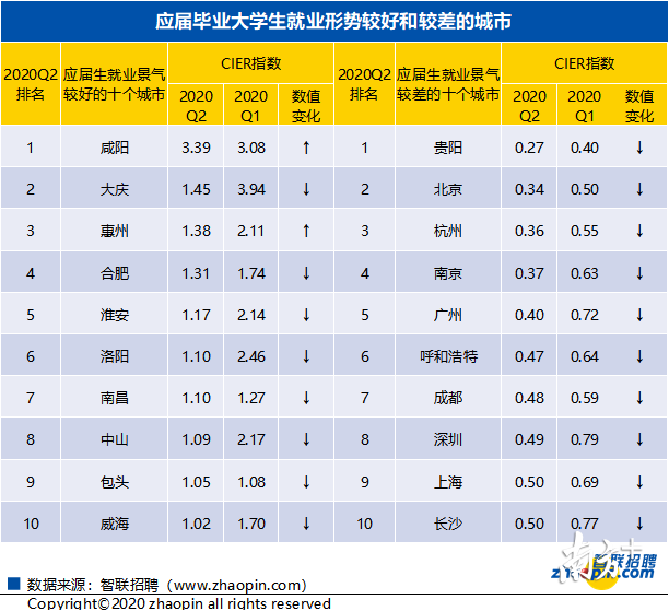 《報告》顯示,二季度應屆生CIER指數(shù)較高的城市為二、三線城市,例如,咸陽、大慶、惠州、合肥和淮安等,這些城市的CIER指數(shù)均要高于1。而在應屆生就業(yè)景氣較差的城市中,北上廣深等一線城市,以及杭州、南京、成都等新一線城市的應屆生CIER指數(shù)相對較低,就業(yè)競爭相對激烈。