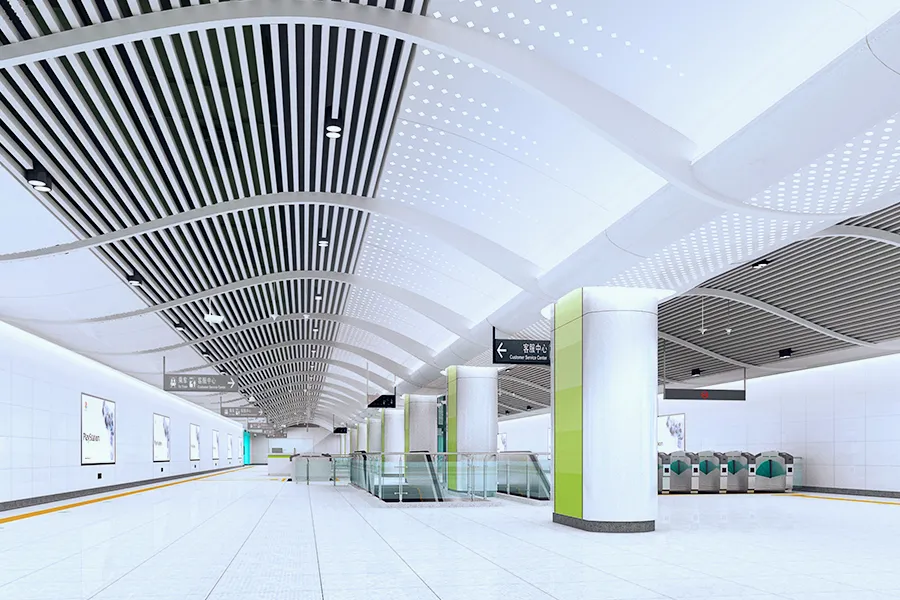 通新嶺站位于福田區(qū)上步路與紅荔路交叉口南側(cè)上步路上,呈南北向布置。車站為地下三層單柱雙跨結(jié)構(gòu),共設(shè)出入口3個(gè):A、E、F。此外,與3號(hào)線通道換乘。