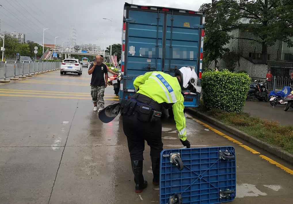 8月5日9時(shí)30分許,深圳交警鐵騎隊(duì)員雨中巡邏至新沙路時(shí),發(fā)現(xiàn)德昌電機(jī)廠路段有一輛貨車停在路上,導(dǎo)致交通擁堵。貨車司機(jī)在旁,鐵騎上前詢問情況后得知貨車故障,司機(jī)被迫將車停在路邊。